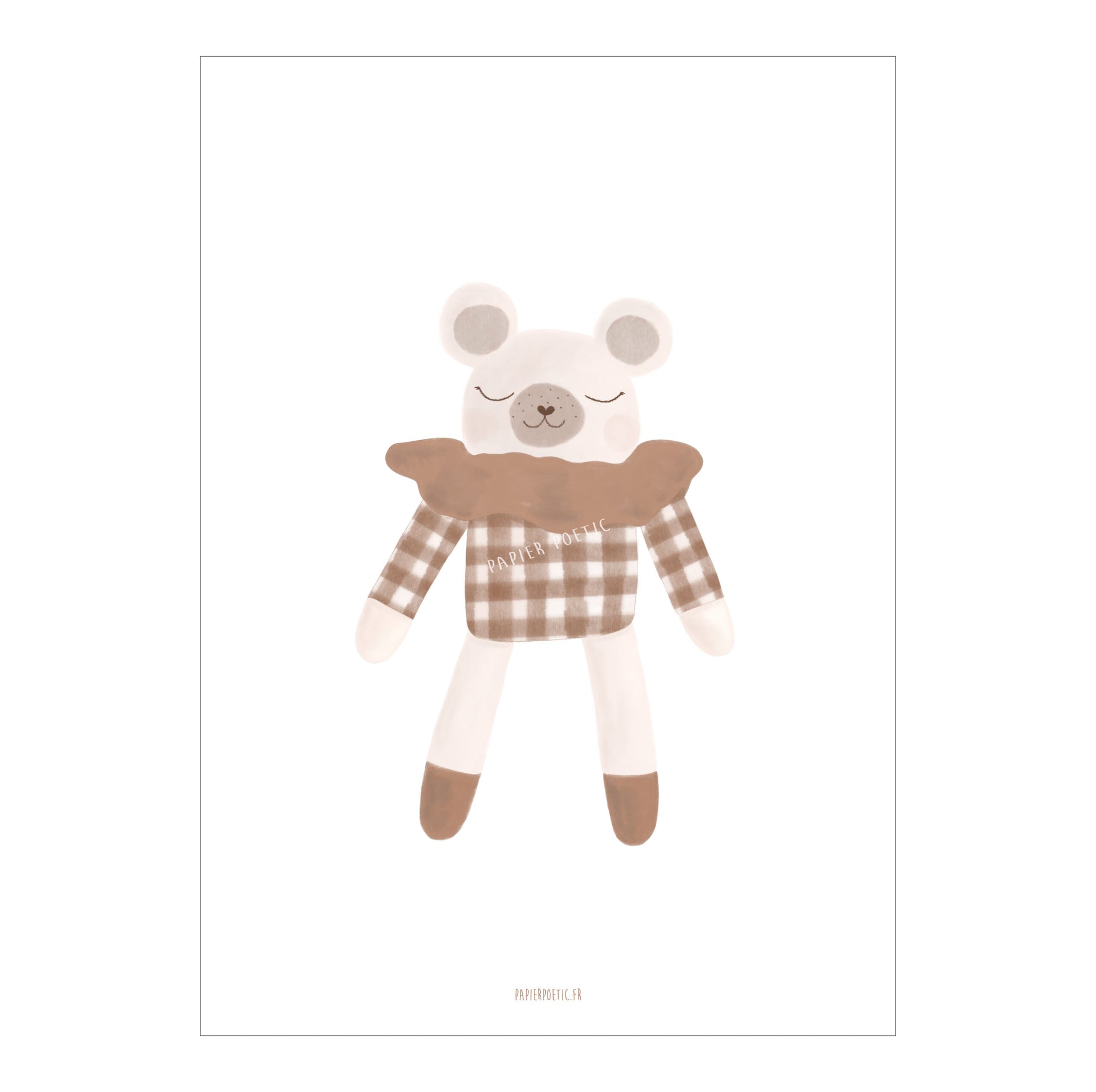 Cette belle affiche illustrée met en scène un adorable ours en peluche habillé d’un joli motif vichy, apportant douceur et charme à l'univers de votre enfant. Parfaite pour décorer la chambre de bébé ou pour offrir en cadeau, cette illustration intemporelle séduira petits et grands.