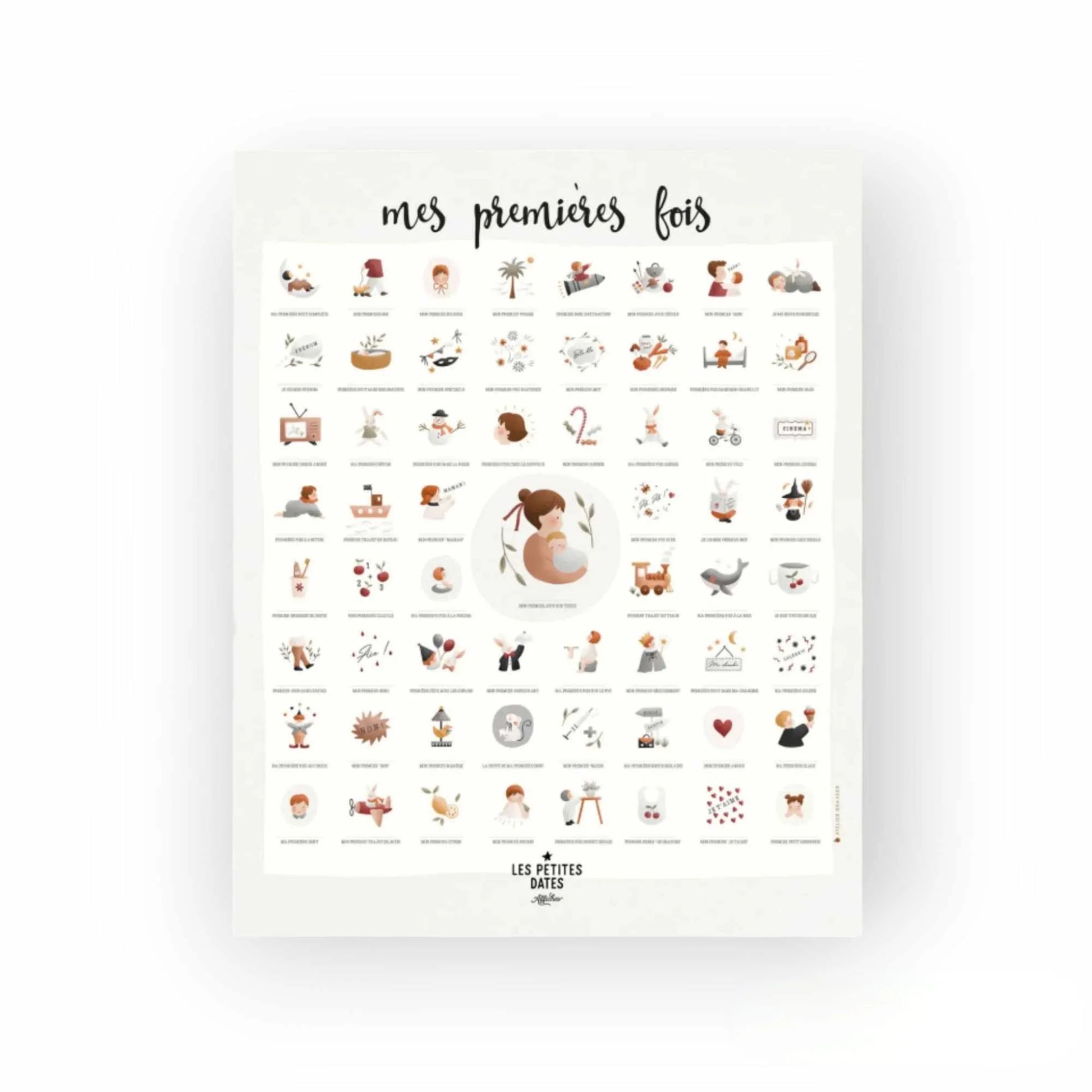 Chaque moment spécial, de "Mon premier jour sur Terre" à "Mon premier trajet en avion", peut être marqué d'une date grâce au tampon fourni. Avec un total de 61 premières fois, cette affiche devient le témoin visuel des souvenirs précieux à partager et à garder pour toujours.