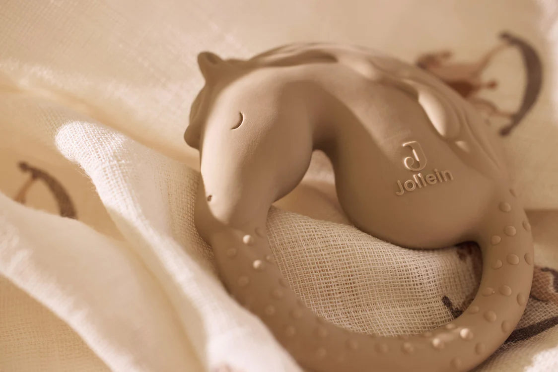 Offrez à votre bébé un allié sûr et pratique pour ses poussées dentaires avec cet anneau de dentition en caoutchouc naturel. Conçu en forme de cheval et dans une délicate teinte Biscuit, ce jouet est à la fois robuste, doux et adapté aux petites mains curieuses.