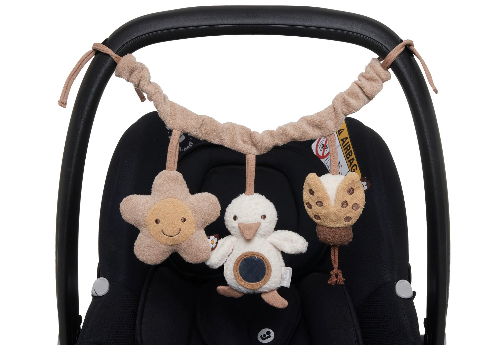 Ajoutez du fun à vos promenades avec la chaîne d'activités Jollein ! Équipée de 3 adorables doudous (fleur, canard, coccinelle) avec éléments crépitants, cette chaîne stimule l’éveil de votre bébé. Le canard a un miroir et l'abeille fait un doux bruit.