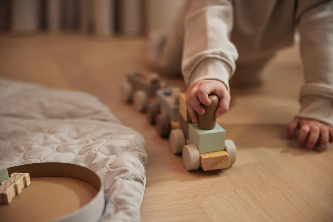 Tchou tchou, voici le train qui s'en va ! Ce train-jouet en bois offre de nombreuses possibilités de jeu. La locomotive et ses deux wagons peuvent être détachés et réassemblés, ce qui aide votre enfant à développer sa motricité fine. Ce jouet stimule également les sens de votre enfant en l’aidant à explorer les formes, les couleurs et les textures.