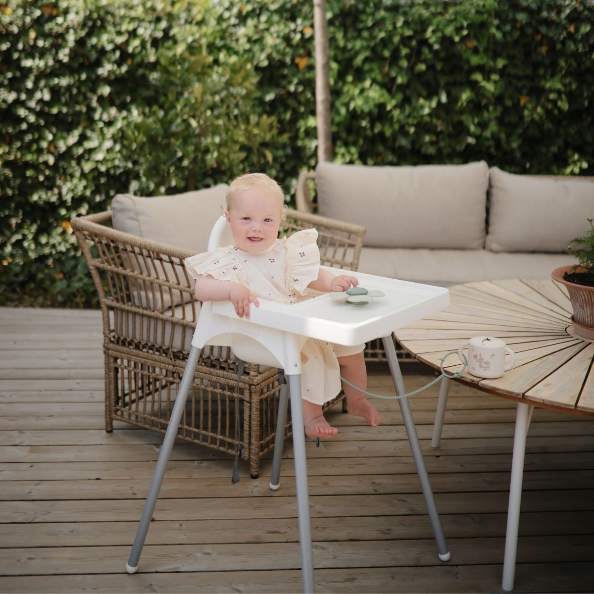 - Ventouse intégrée : Permet de fixer le jouet sur différentes surfaces (tables, chaises, baignoire...) pour éviter les chutes et favoriser le jeu autonome.
